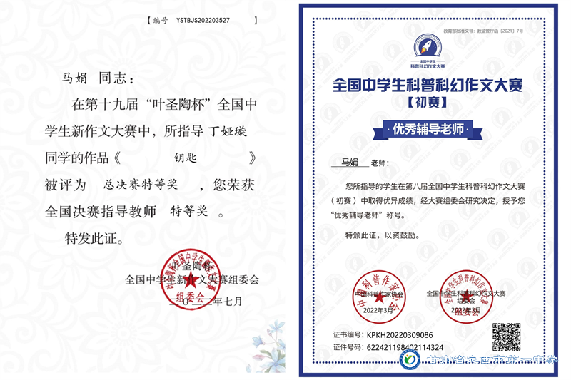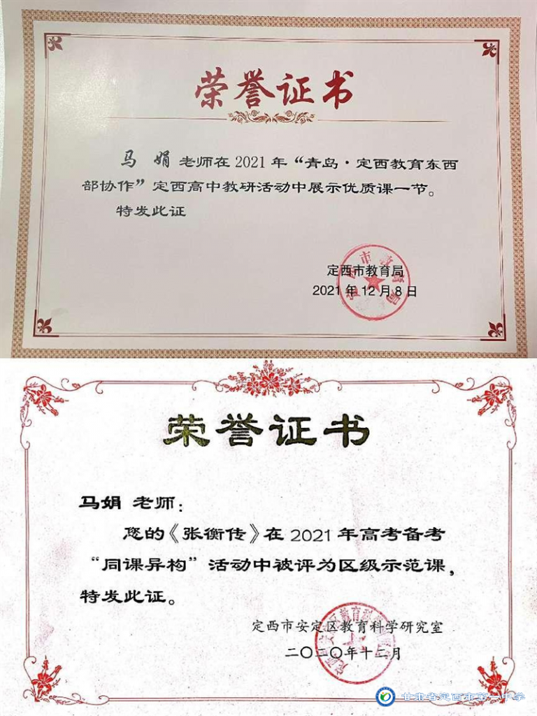 她积极上进,努力不辍。荣获第一届“三字一话”技能大赛一等奖,课例《醉花阴》在“一师一优课,一课一名师”活动中被评为“省级优课一等奖”,在第十九届“叶圣陶杯”全国中学生新作文大赛中获全国决赛指导教师特等奖,课例《张衡传》在 2021 年高考备考“同课异构”活动中被评为区级示范课,在“青岛•定西教育东西部协作”定西高中教研活动中展示优质课一节,曾多次获校内优质课比赛一等奖,省级论文大赛二等奖。