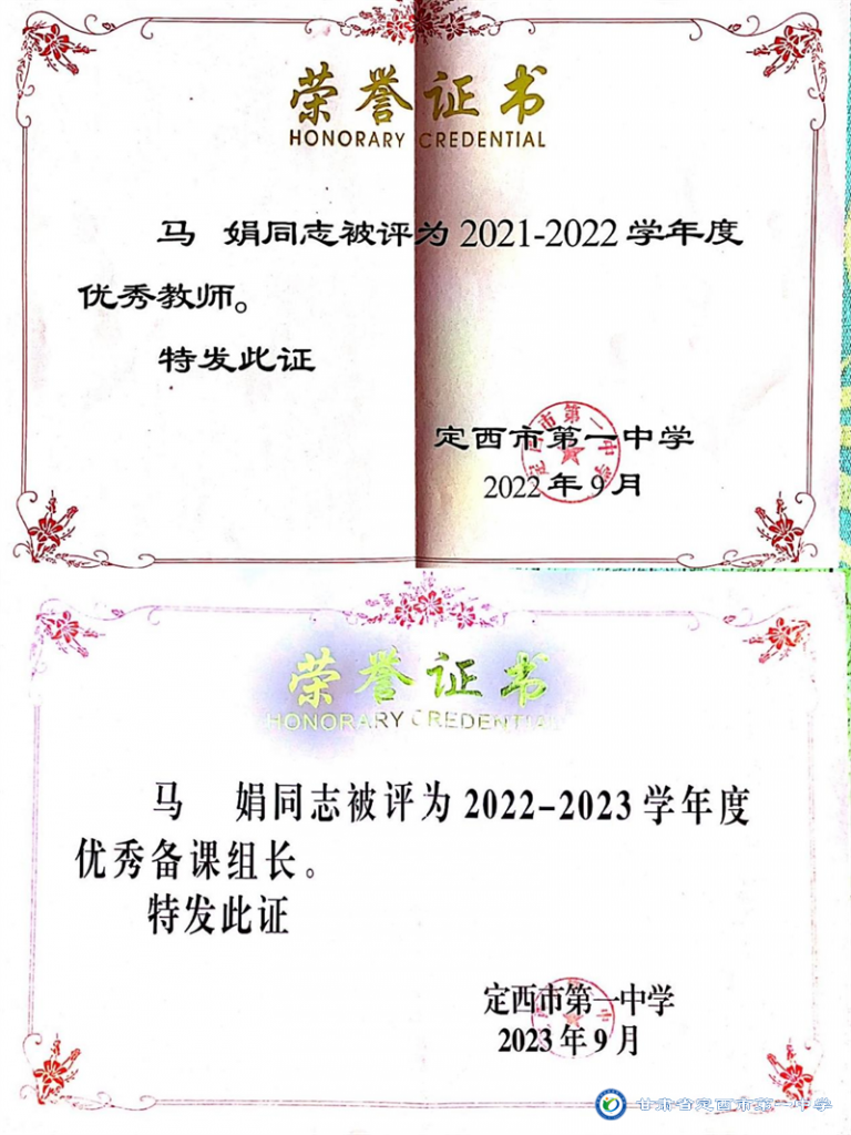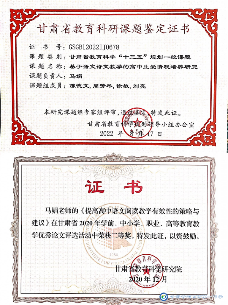 马娟,定西市第一中学中级语文教师,2007年毕业于陕西师范大学。担任语文教学工作,兢兢业业;兼任校报第四版编辑工作,一丝不苟。多次被学校评为优秀教师、优秀备课组长,主持省级课题一项,参与多项省市级课题研究,在省级以上刊物发表教育教学文章多篇,辅导学生在各类作文大赛中斩获佳绩。