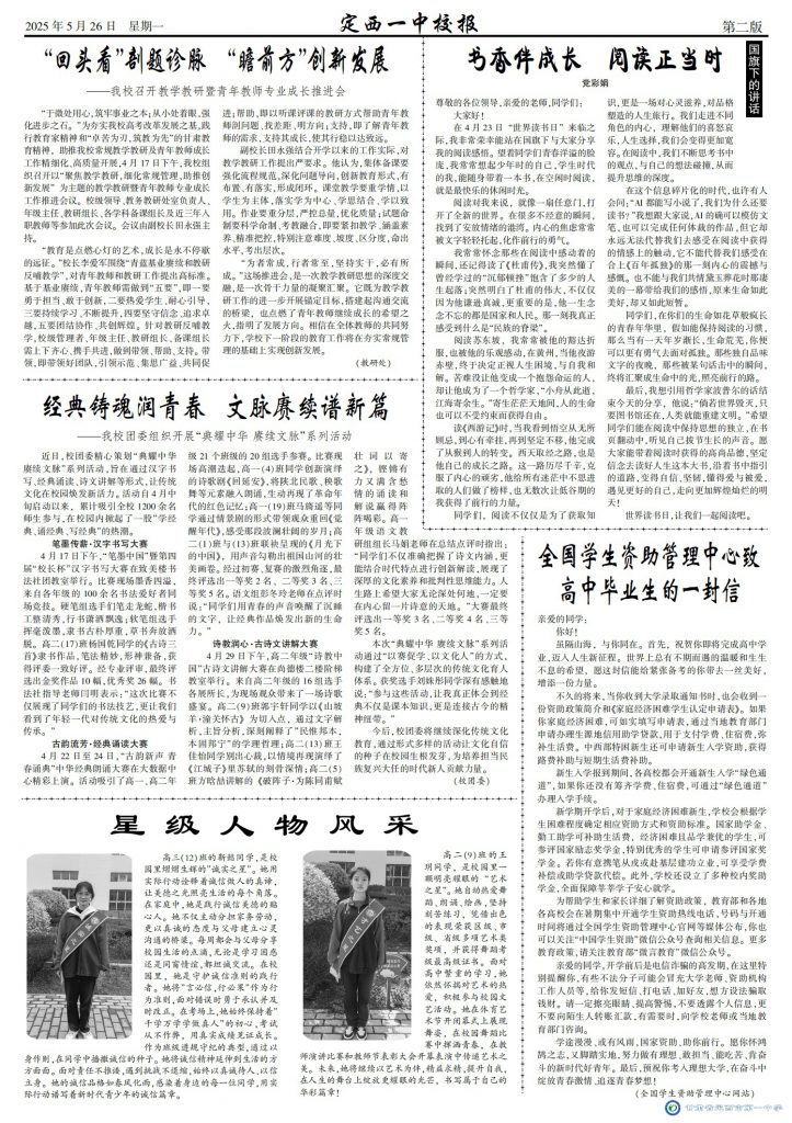 【“三抓三促”行动进行时】定西一中校报2025年第三期 时间:2025-05-27 分类:三抓三促/ 校报校刊 (撰稿:董立顺 审核:王景龙 田永强 监审:肖进雄) 定西一中校报2025年 第三期下载 分享: 上一个: 【“三抓三促”行动进行时】定西市第一中学开展生成式AI教学应用专题培训 下一个: 【“三抓三促”行动进行时】陇原以“行”筑梦未来 双高密接架构“心桥” 相关文章 喜报——我校学子在2025年第42届全国中学生物理竞赛甘肃联赛中荣获佳绩 定西一中“对话名校 筑梦未来”系列活动|哈尔滨工业大学专场 【区域联动 众行致远】智慧共享 智研共赢 【研经悟理 授业传道】广学集智逐光行,求变则通耘梦田 【“三抓三促”行动进行时】定西一中校报2025年第八期 【“三抓三促”行动进行时】师徒同心展匠心 青蓝携手绽芳华 【“三抓三促”行动进行时】帮扶搭台连校际 互鉴同行共育人 【“三抓三促”行动进行时】区域联动促深度交流 携手并进谋共同发展