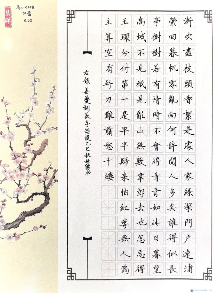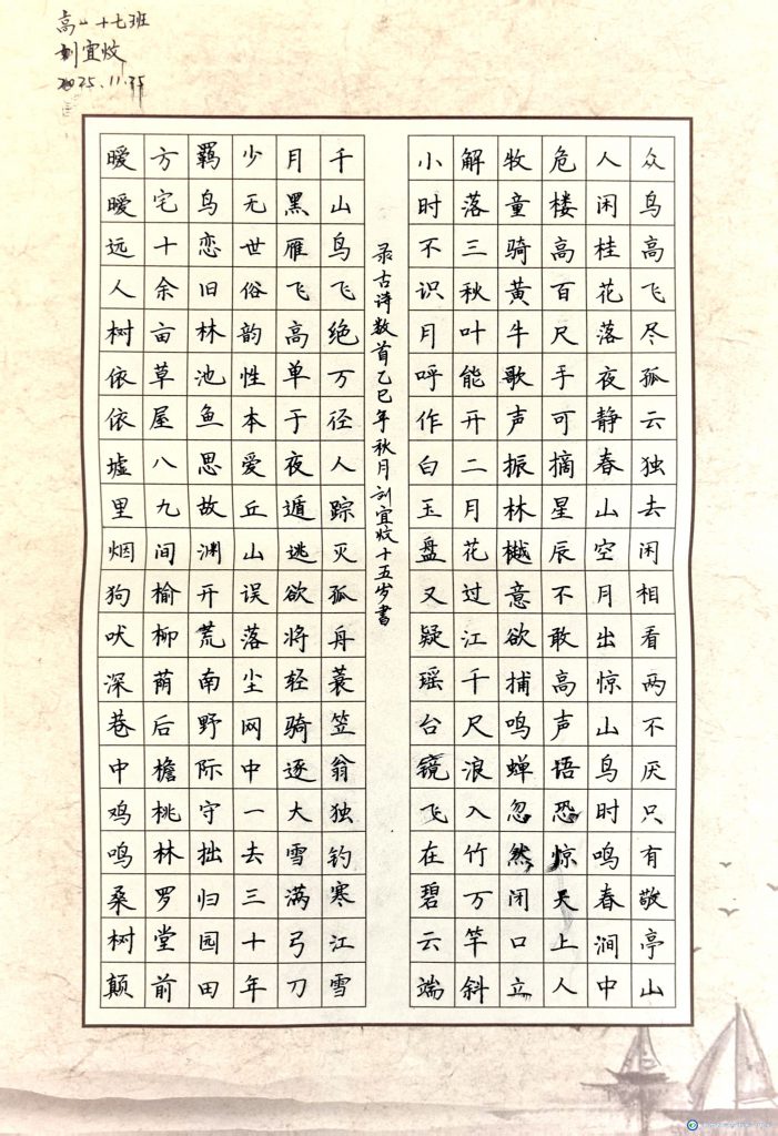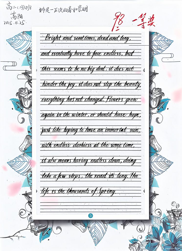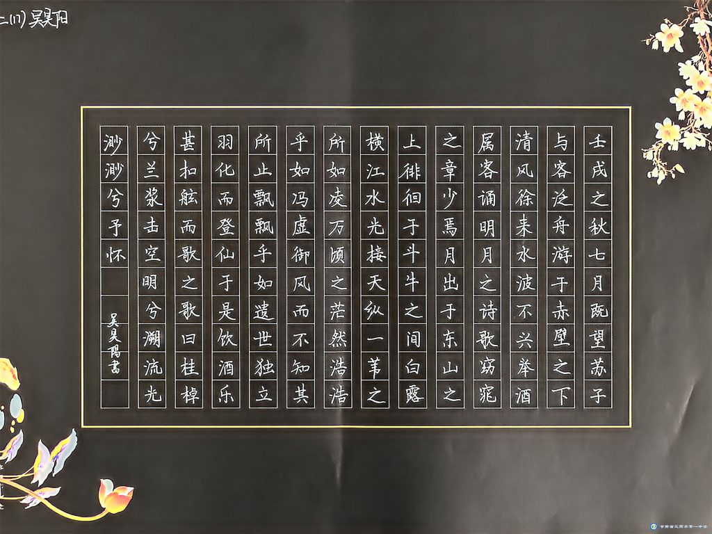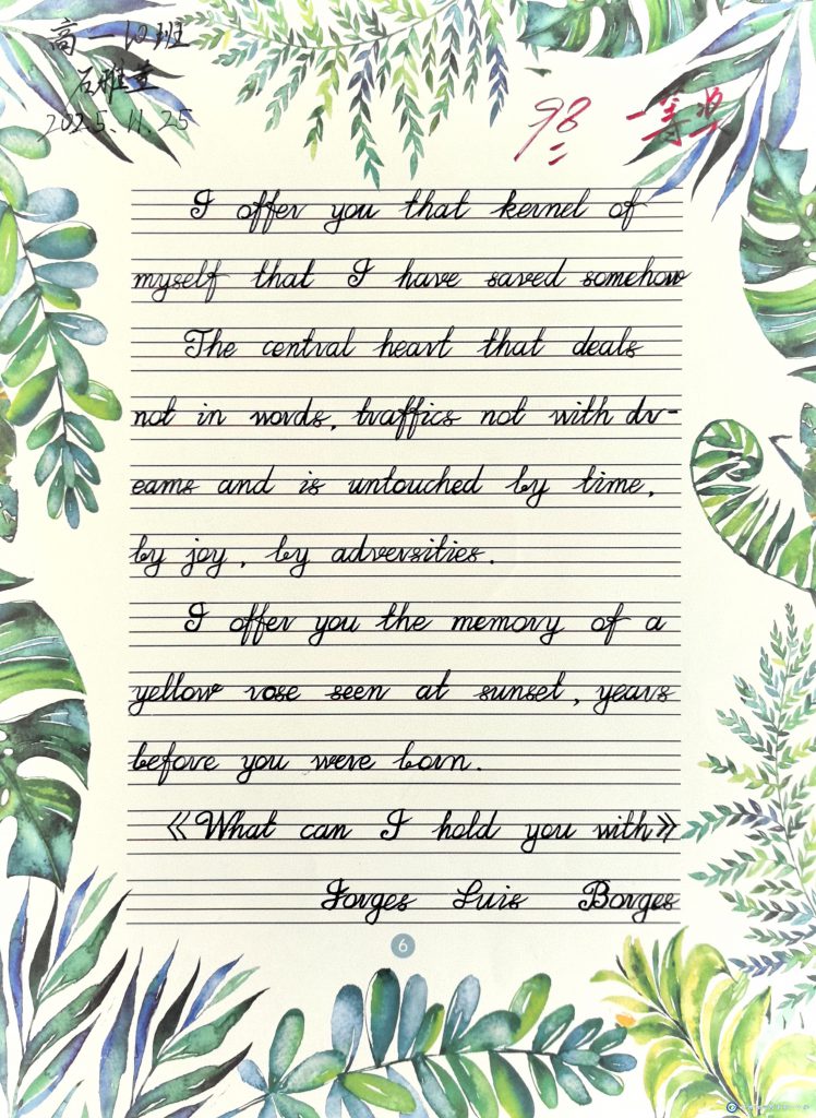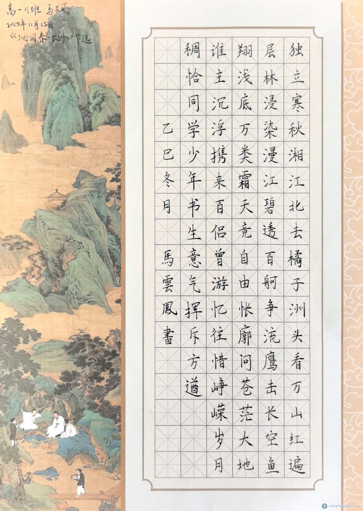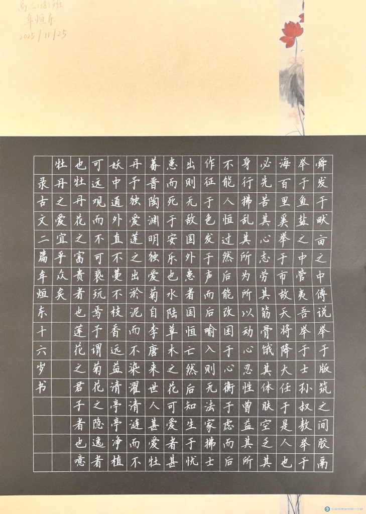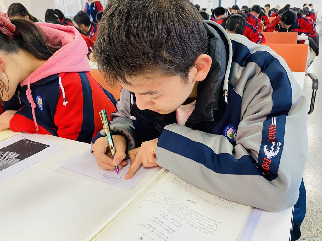 大赛自启动以来,得到了高一、高二年级同学的积极响应。11月25日下午17时,比赛正式开始,赛场内秩序井然,参赛选手们自备黑色钢笔和书写纸,凝神静气、笔走龙蛇。选手们紧扣“中华经典”主题,或书写古今诗文、楹联、名言警句,或选取英文经典诗歌节选创作,以楷书、行书两种字体精心书写,一笔一划既展现出扎实的书写功底,也饱含着对中华优秀传统文化的理解与热爱。