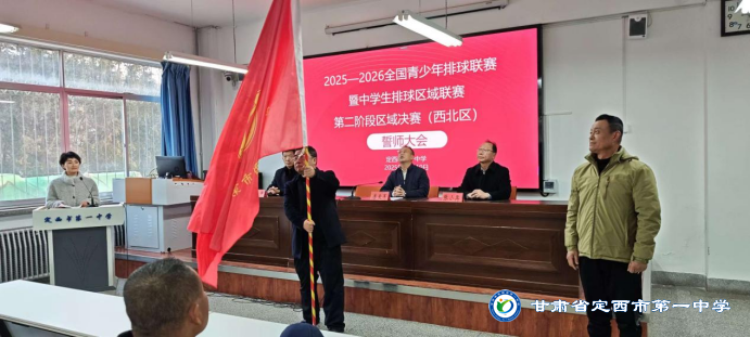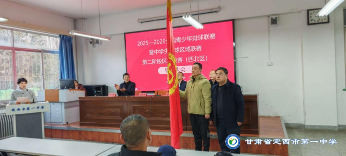 致辞结束后,激动人心的授旗仪式正式开始。党委书记刘顺义亲手将一面印有我校校徽的红色战旗郑重地授予领队教师周炜。这面旗帜鲜红夺目,它不仅仅是一面普通的旗帜,更象征着责任与担当的传递。接过战旗的周炜老师,神情庄重而坚定,他高举战旗,用力挥舞,仿佛在向所有人宣告:定西市第一中学排球队已经做好了迎接挑战的准备!